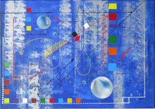 Desc. : fond bleu foncé ; traînées argent ; lignes courbes et droites, points et formes de couleurs soutenues.