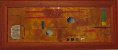 Desc. : fond jaune orangé, rouge, bleu ; Sphères peinture brillante, gris, bleu ; lignes courbes et droites, points de couleurs et forme de couleurs.